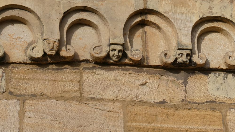 St. Godehard ist auch von außen immer eine Freude. Bei genauerem Hinsehen erkennt man den umlaufenden Bogenfries. Aber nur im östlichen Teil enden die Bögen in kleinen Köpfen.